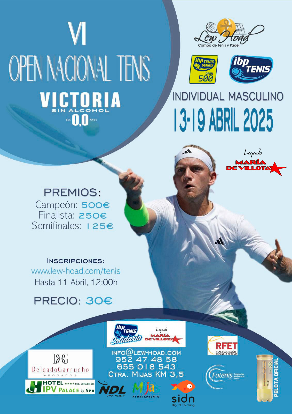Para inscribirte en el Open Nacional Victoria 0,0, es necesario contar con la licencia federativa en vigor. Las inscripciones se gestionan a través de la página web de IBP Tenis. También puedes obtener más información llamando al teléfono +34 952 47 48 58 o el siguiente email: info@lew-hoad.com