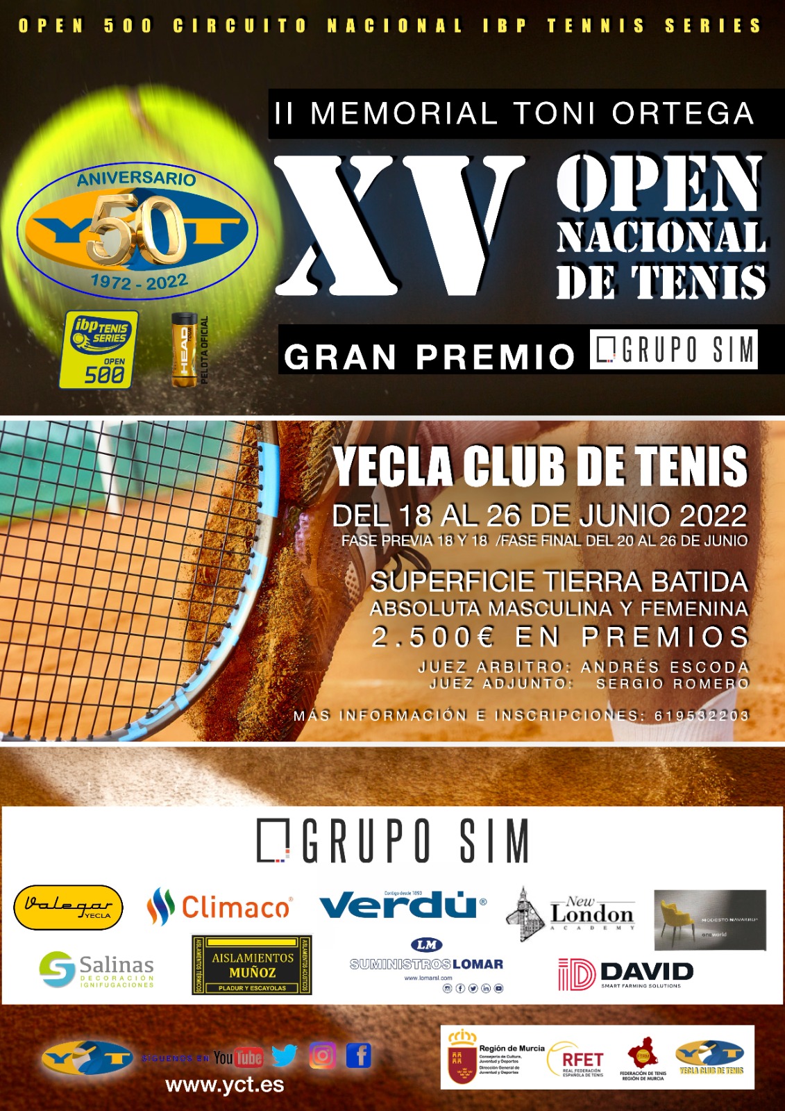 El Yecla Club de Tenis organiza una nueva edición del OPEN NACIONAL DE TENIS “GRAN PREMIO GRUPO SIM”, que tendrá lugar del 9 al 15 de junio. El torneo cumple este año su XVII edición, y está dedicado desde hace cuatro años a la memoria de Toni Ortega, quién fue durante muchos años director deportivo […]