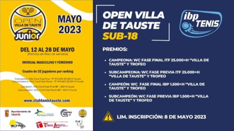 Os presentamos el I Open Villa de Tauste de Tenis Sub-18, que tendrá lugar en su sede, El Club de Tenis de Tauste, del 12 al 28 de mayo de 2023.